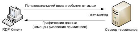 Сервер — это компьютер, К которому происходит удаленное подключение. RDP-клиент — приложение на компьютере, С которого происходит подключение. Во время сессии все вычислительные процессы лежат на плечах сервера. На RDP-клиент поступает графический интерфейс ОС сервера, которой RDP-клиент управляет с помощью устройств ввода. Графический интерфейс на RDP-клиент поступает в виде точной копии графического вывода ОС сервера или в виде графических примитивов (прямоугольники, круги, текст и т.п.) для экономии трафика. По умолчанию RDP использует порт 3389, но его можно поменять при необходимости.